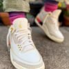 These AJ1s have been created in collaboration with Jordan, American rapper Travis Scott and Hiroshi Fujiwara’s Fragment Design. They’re crafted from panels of white, black and blue leather and set apart by a collection of logos. Travis’ inverted Swoosh details the sides while the Cactus Jack branding and the iconic double lightning motif are etched into the left and right heels accordingly. Ever present, the Wings Insignia lends them a final stamp of identity.